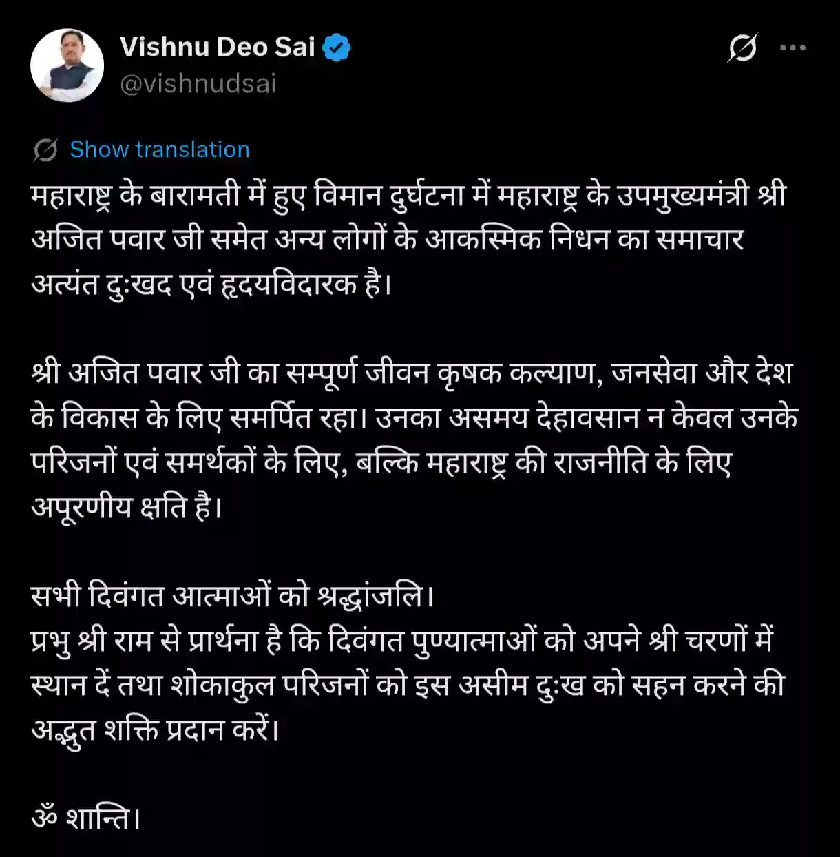 महाराष्ट्र के उपमुख्यमंत्री अजित पवार के आकस्मिक निधन पर मुख्यमंत्री विष्णुदेव साय ने व्यक्त किया शोक