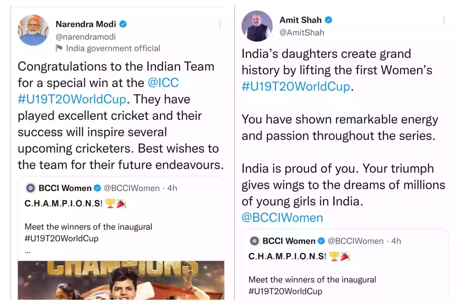 पीएम मोदी और अमित शाह ने अंडर-19 महिला टी20 टीम को विश्व विजेता बनने की बधाई दी
